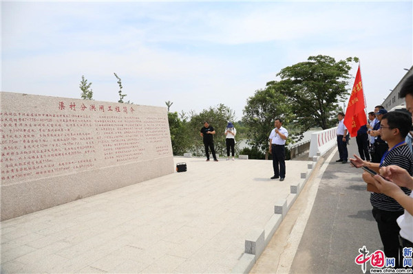 2019年6月12日,濮陽縣渠村。渠村分洪閘除險加固工程于2017年3月25日正式開工,包括閘室段混凝土缺陷處理,機架橋、公路橋拆除重建等項目。2018年6月20日成功實施閘門聯(lián)合啟閉試驗,基本具備分滯洪條件。工程于2018年12月正式完工。圖為渠村引黃入冀補淀渠首閘負責(zé)人在渠村分洪閘工程簡介石碑前為采訪團記者講解。記者趙超 攝