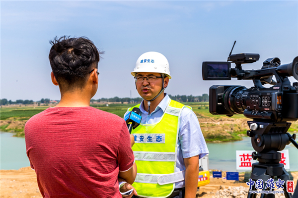 南拒馬河防洪治理工程項(xiàng)目負(fù)責(zé)人李青山向記者介紹工程進(jìn)展情況。中國雄安官網(wǎng)記者馬夢迪 攝