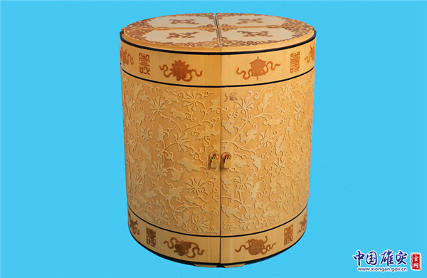 王樂(lè)修介紹,竹簧的制作是一種非常復(fù)雜的工藝,往往需要十幾道工序。竹簧的材料是用毛竹、楠竹,去其外皮,刮去竹肉,留下毫米左右的竹內(nèi)層叫竹簧,將其竹簧片曬干后粘貼在各種形狀的木胎上,雕刻出花紋圖案。竹簧工藝打破了竹子原材料的局限性,可方、可圓、可扁,器物完美。作品突出了傳統(tǒng)宮廷吉祥紋飾,融入了傳統(tǒng)文化韻味,雕刻精細(xì),栩栩如生。