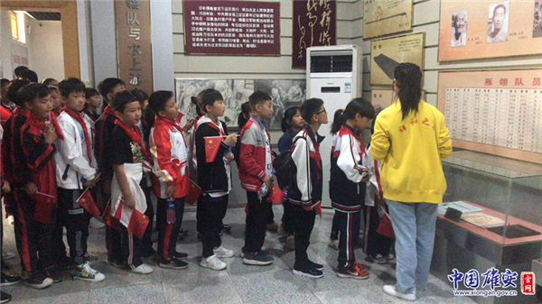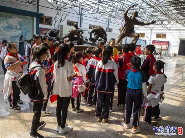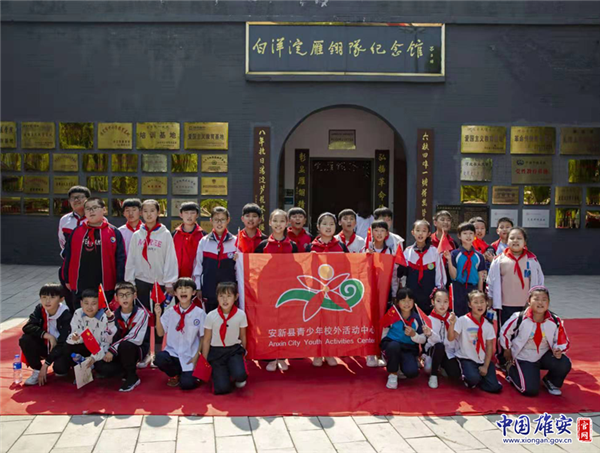 孩子們?cè)诎籽蟮硌泗彡?duì)紀(jì)念館門口合影留念。中國雄安官網(wǎng)發(fā)