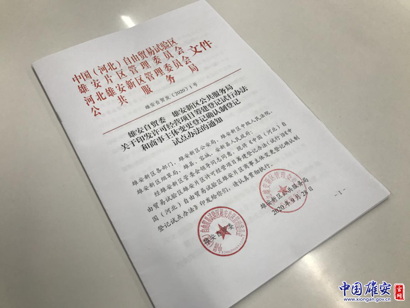 《中國(河北)自由貿(mào)易試驗(yàn)區(qū)雄安片區(qū)許可經(jīng)營項(xiàng)目籌建登記辦法(試行)》《中國(河北)自由貿(mào)易試驗(yàn)區(qū)雄安片區(qū)商事主體變更登記確認(rèn)制登記試點(diǎn)辦法》印發(fā)。中國雄安官網(wǎng)記者毛鶴然 攝