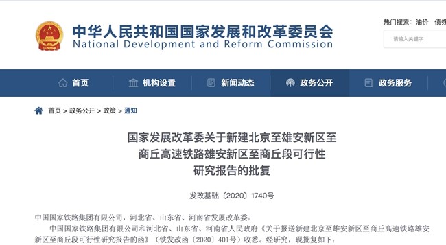 這是從國家發(fā)改委官方網(wǎng)站12月15日發(fā)布的《國家發(fā)展改革委關(guān)于新建北京至雄安新區(qū)至商丘高速鐵路雄安新區(qū)至商丘段可行性研究報告的批復(fù)》(以下簡稱“批復(fù)”)中獲悉的。