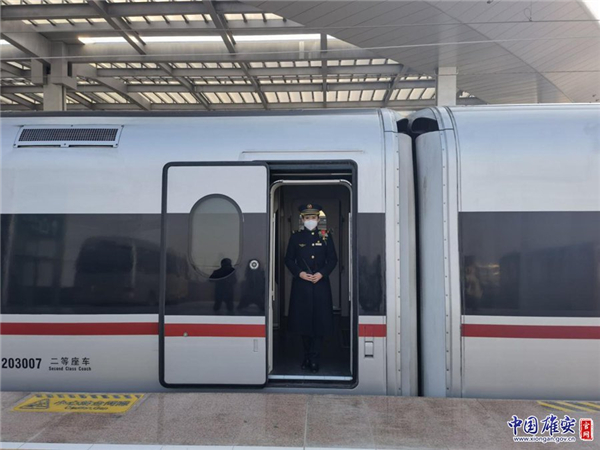 C2702次復(fù)興號(hào)列車乘務(wù)員迎接旅客上車。中國雄安官網(wǎng)記者劉東堯 攝