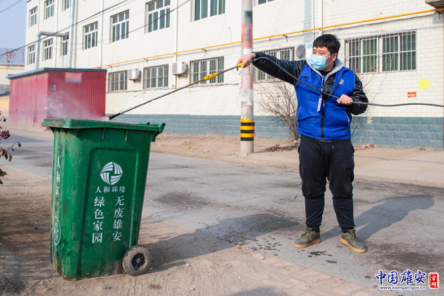 三臺(tái)鎮(zhèn)崔公堤村黨支部工作人員對(duì)垃圾桶進(jìn)行噴灑消毒。中國雄安官網(wǎng)記者牛思佳 攝