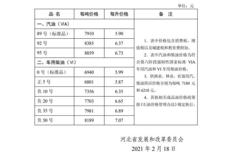 2月18日,河北省發(fā)展和改革委員會(huì)發(fā)布《關(guān)于調(diào)整我省成品油價(jià)格的公告》。根據(jù)現(xiàn)行成品油價(jià)格形成機(jī)制,自2021年2月18日24時(shí)起,河北省汽、柴油價(jià)格(標(biāo)準(zhǔn)品)每噸分別提高275元、265元,調(diào)整后的汽、柴油最高零售價(jià)格見下表。乙醇汽油價(jià)格按同標(biāo)號汽油(VIA)價(jià)格執(zhí)行,普通柴油價(jià)格按照同標(biāo)號車用柴油(VI)價(jià)格執(zhí)行,98號汽油價(jià)格由成品油生產(chǎn)經(jīng)營企業(yè)根據(jù)市場情況自主制定具體價(jià)格。(河北日報(bào)記者潘文靜)