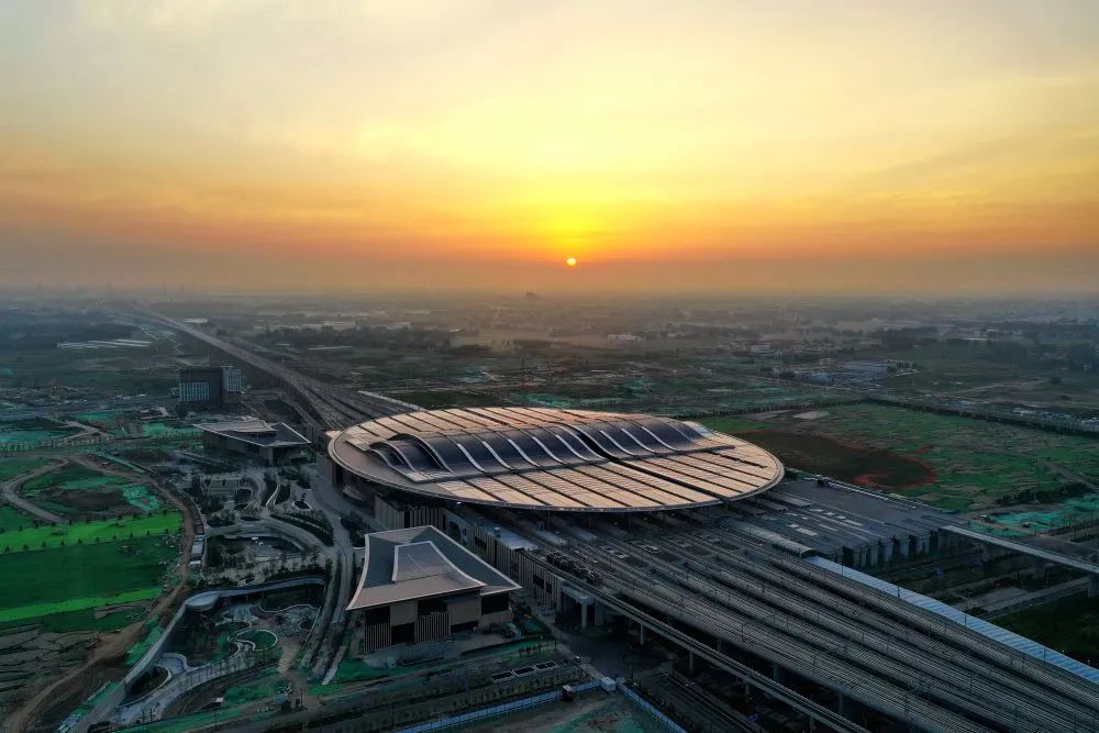 7月1日在河北雄安新區(qū)京雄城際鐵路雄安站拍攝的日出(無人機照片)。新華社記者牟宇 攝