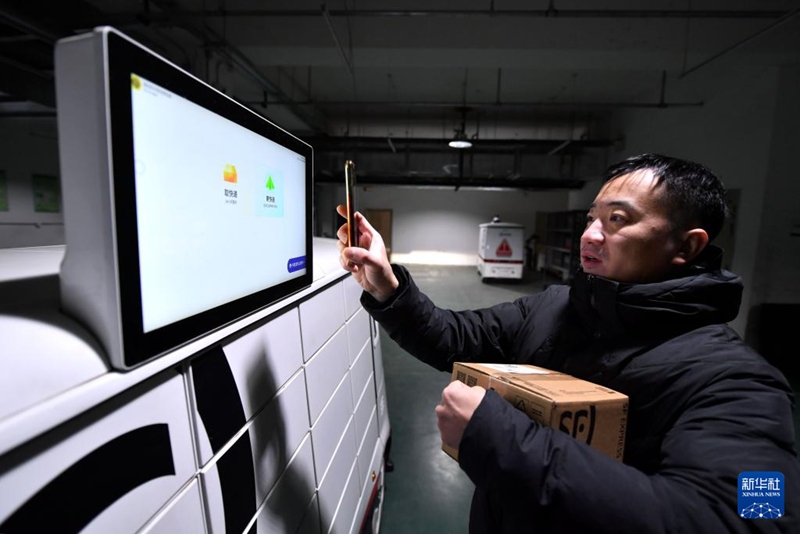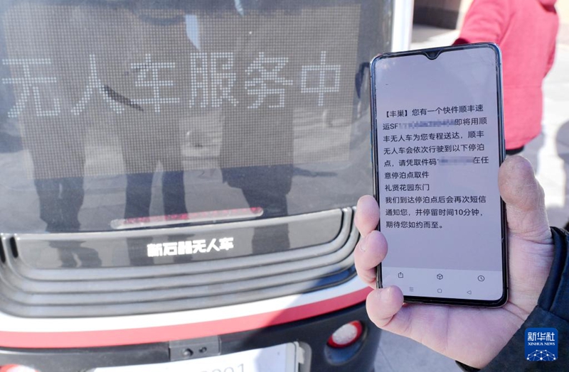 1月22日,居民收取無人駕駛配送車送來的郵件。新華社記者 王曉 攝