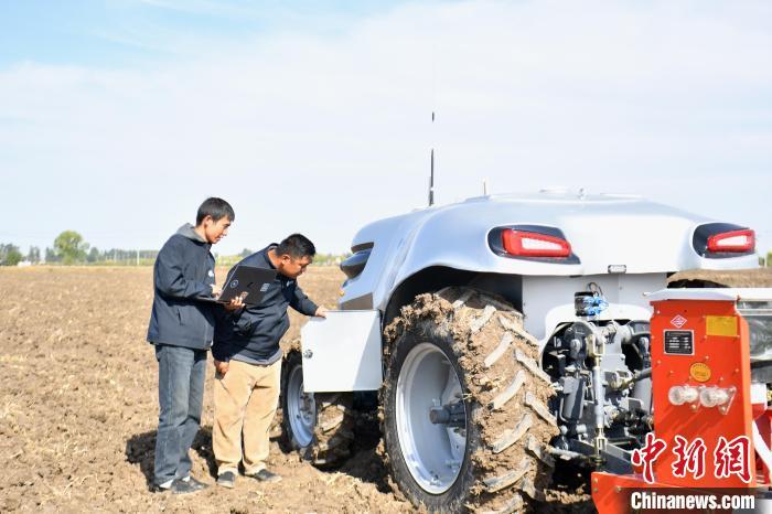 10月22日,河北雄安新區(qū)安新縣端村鎮(zhèn)關(guān)城二村一農(nóng)田內(nèi),工作人員對“鴻鵠T70”電動智能拖拉機(jī)進(jìn)行秋播作業(yè)前檢測。中新社記者 韓冰 攝