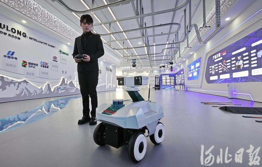 1月18日,雄安新區(qū)科創(chuàng)中心中試基地內(nèi),北京普龍科技有限公司銷售部總經(jīng)理童浩軒演示操作智能巡檢機(jī)器人。河北日?qǐng)?bào)記者曹錚 攝