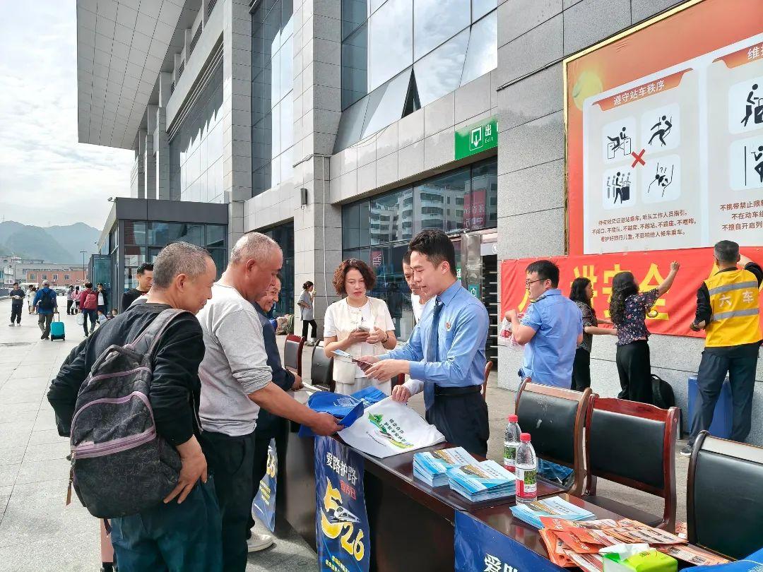 據(jù)了解,宣傳現(xiàn)場(chǎng)不僅發(fā)放各類法律法規(guī)宣傳資料,還通過(guò)音響語(yǔ)音播放鐵路法律法規(guī)及相關(guān)安全知識(shí),組織群眾參與現(xiàn)場(chǎng)互動(dòng)。六盤水市人民檢察院、六盤水工電段、六盤水車務(wù)段、六盤水鐵路派出所等單位向來(lái)往群眾講解了有關(guān)鐵路安全的法律法規(guī)。