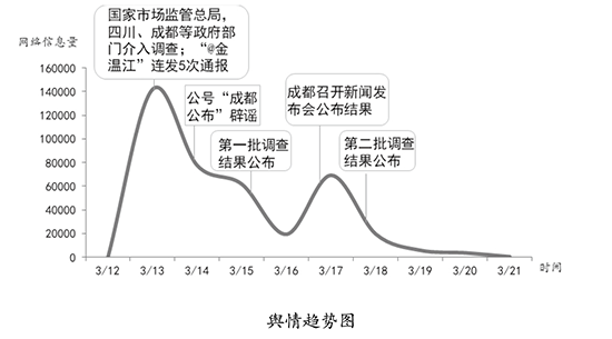 3月14日10時(shí)許,微信公眾號(hào)“成都發(fā)布”刊發(fā)文章《這些謠言信不得!》,盤點(diǎn)了警民沖突、家長跳樓、家長臥底等流傳甚廣的六大謠言。隨后,中國網(wǎng)、鳳凰網(wǎng)、四川在線等多家媒體轉(zhuǎn)載,對(duì)遏制網(wǎng)絡(luò)謠言起到?jīng)Q定性作用。相關(guān)部門回應(yīng)后,公眾討論逐步回歸食品安全本身,輿情呈現(xiàn)降溫跡象。