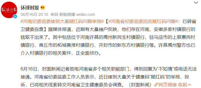 編者按:6月13日,網(wǎng)絡(luò)流傳信息顯示,多名前往鄭州溝通村鎮(zhèn)銀行“取款難”的儲(chǔ)戶被賦“紅碼”。6月16日,有媒體致電河南省行政審批和政務(wù)信息管理局、省疫情防控指揮部等多個(gè)相關(guān)職能部門,得到回復(fù)為“不知情”或電話無(wú)法接通。河南省紀(jì)委監(jiān)委工作人員表示,近日接到大量關(guān)于健康碼“賦紅碼”的舉報(bào)和投訴,已將相關(guān)線索轉(zhuǎn)交省衛(wèi)生健康委員會(huì)調(diào)查。