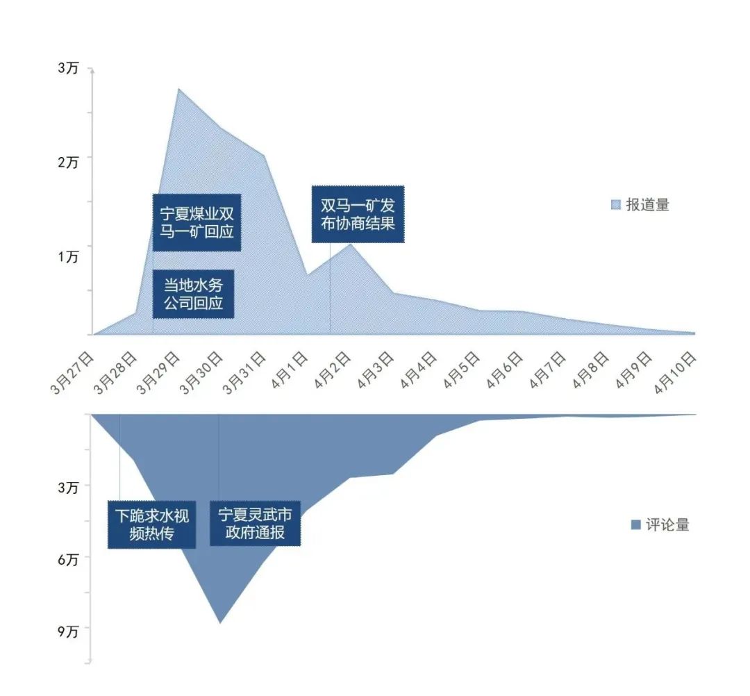 3月29日,部分中央主流媒體發(fā)聲表態(tài):“@中國(guó)新聞網(wǎng)”稱“‘缺水’的輿論場(chǎng)需要真相甘霖”;央廣網(wǎng)推出文章《萬(wàn)畝治沙林被煤礦“斷水”?供水和調(diào)查必須馬上到位》,指出當(dāng)?shù)乇仨毐M快用客觀公正的調(diào)查還原真相,給林場(chǎng)主一個(gè)交代,給萬(wàn)畝林場(chǎng)一個(gè)交代,也給公眾一個(gè)交代。輿論場(chǎng)還曝光一份判決書(shū),顯示寧夏回族自治區(qū)銀川市中院曾作出判決,明確該煤礦占用林地,要求賠償孫國(guó)友727.54萬(wàn)元。另?yè)?jù)九派新聞報(bào)道,當(dāng)?shù)厮畡?wù)公司負(fù)責(zé)人稱,礦場(chǎng)污水處理達(dá)標(biāo),但是水的鹽分過(guò)高澆不了樹(shù)。煤礦一方稱,污水處理設(shè)備容量比較小,每天只能處理兩千立方,且資金成本太大,不想加大投入。靈武市政府相關(guān)人員向媒體表示,正在針對(duì)此事協(xié)調(diào)處理。當(dāng)日,“#萬(wàn)畝樹(shù)木被煤礦斷水面臨枯死#”“#水務(wù)公司回應(yīng)萬(wàn)畝林場(chǎng)主跪地求供水#”等相關(guān)微博話題沖上熱搜榜前列,輿情熱度達(dá)到峰值。部分網(wǎng)民表示,經(jīng)歷了沙塵暴,才能真正明白造林治沙的好處和難處,“不能讓好人流汗流淚又流血”。微博大V“@胡錫進(jìn)”也呼吁,希望不用下跪崩潰引起巨大輿情也能正常解決。