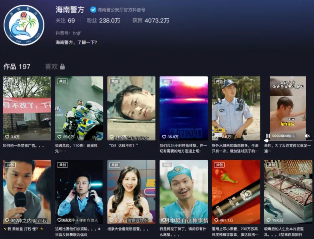 豐富的傳播渠道和多樣的共創(chuàng)模式可以說是“海南警方”短視頻成功破圈的基礎(chǔ)。在傳播渠道方面,“海南警方”拍攝的短視頻會依據(jù)內(nèi)容形式,首先投放在抖音、快手以及微信視頻號等平臺,通過擴(kuò)充社交媒體傳播渠道,最大范圍內(nèi)汲取公域流量,打好用戶底盤。除了以短視頻平臺為核心的投放策略外,“海南警方”還利用其他平臺作為引流渠道,如以日常工作宣傳為主的今日頭條和微博上,“海南警方”發(fā)布對應(yīng)的視頻合集,嘗試突破平臺壁壘,最大程度吸引網(wǎng)民注意力。在創(chuàng)作方式上,“海南警方”根據(jù)視頻內(nèi)容與其他賬號合作,如《這錢不對》和《禁毒版盜夢空間》兩部作品,由于涉及反邪教和禁毒題材,“海南警方”分別與中國反邪教和海南禁毒合作拍攝,這種基于宣傳主旨達(dá)成的合作模式可以幫助賬號有效拓展分眾渠道,觸達(dá)更多用戶?!昂D暇健边€有部分視頻是與下級公安的合作,包括昌江警方、澄邁警方等,這一方面可以發(fā)揮海南警方的虹吸效應(yīng),聚合更多流量助推宣傳效果,另一方面也可以反哺弱勢賬號,打造傳播矩陣,為普法宣傳開辟更多通路。