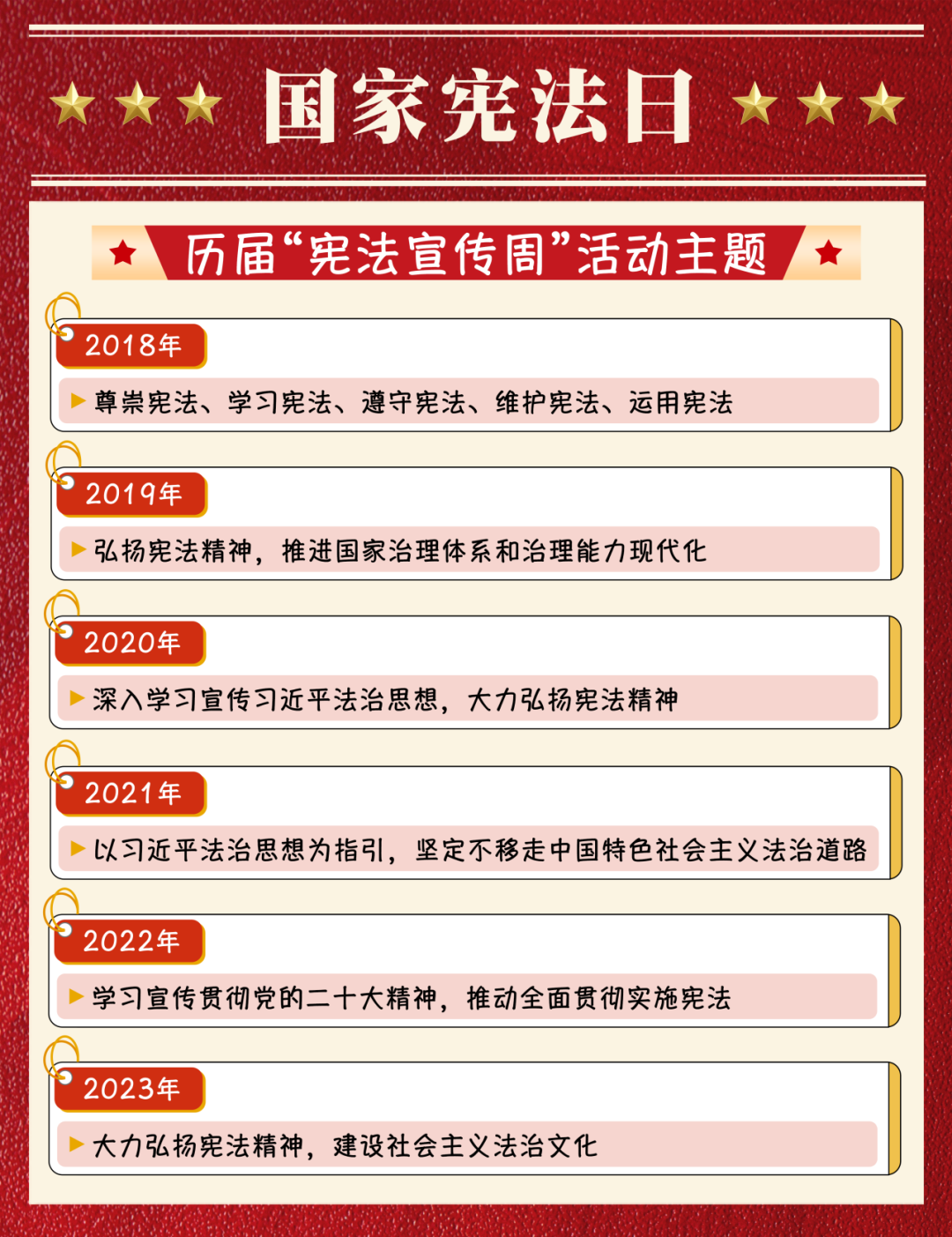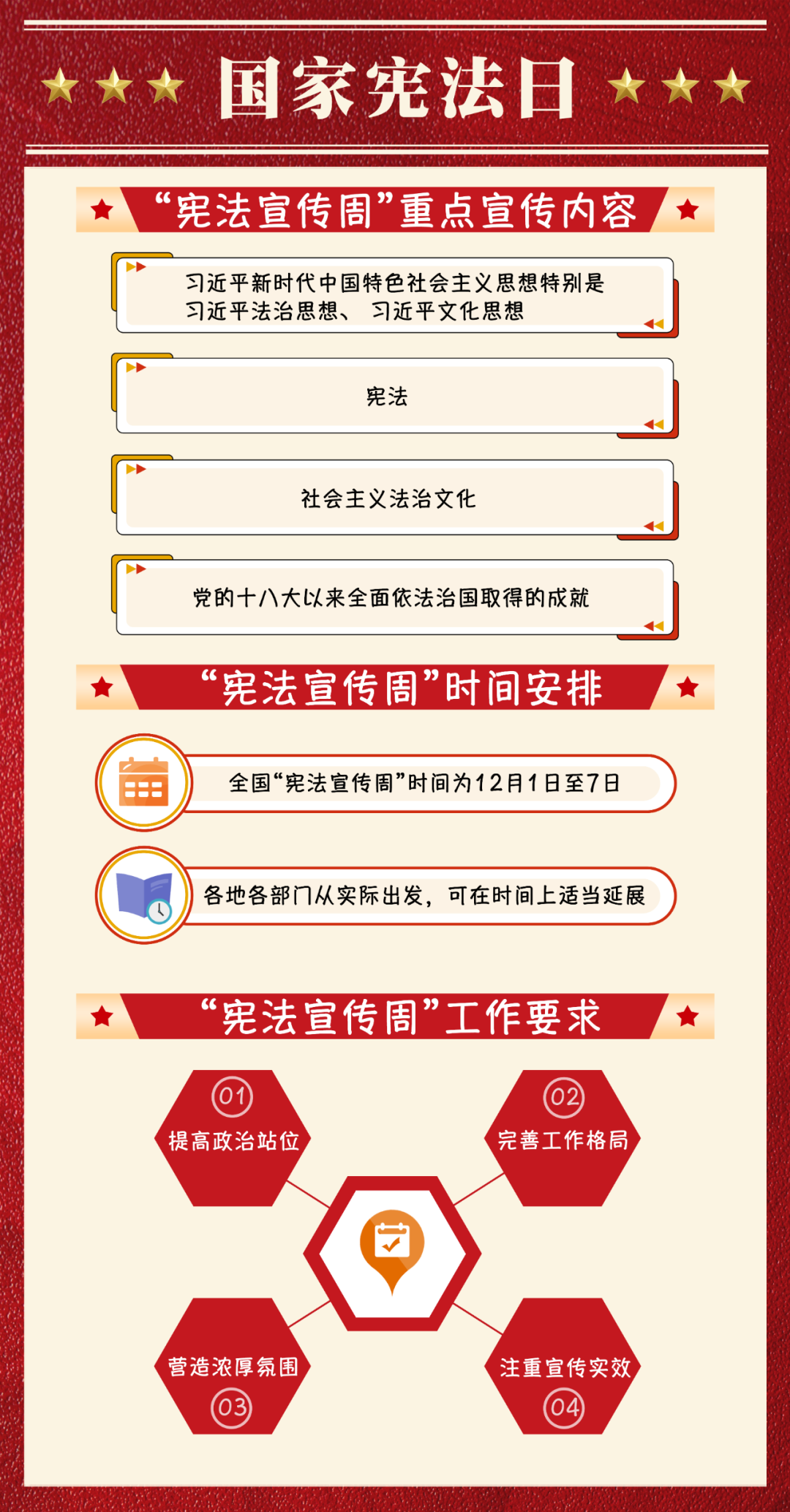 2023年12月4日是第十個(gè)國家憲法日,12月1日至7日是第六個(gè)“憲法宣傳周”,主題是“大力弘揚(yáng)憲法精神,建設(shè)社會(huì)主義法治文化”。