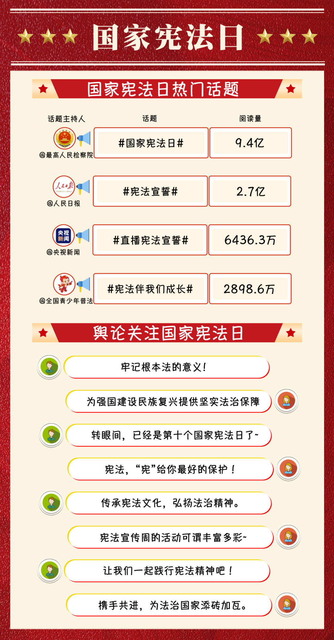 在第十個(gè)國家憲法日到來之際,多方積極宣傳相關(guān)信息,形成了多渠道、深層次的傳播格局,為弘揚(yáng)憲法精神創(chuàng)造良好輿論氛圍?!?國家憲法日#”“#憲法宣誓#”等微博熱門話題閱讀量分別達(dá)到9.4億余次、2.7億余次?!稗D(zhuǎn)眼間,已經(jīng)是第十個(gè)國家憲法日了”“傳承憲法文化,弘揚(yáng)法治精神”“攜手共進(jìn),為法治國家添磚加瓦”等網(wǎng)民留言高居評(píng)論區(qū)前排。
