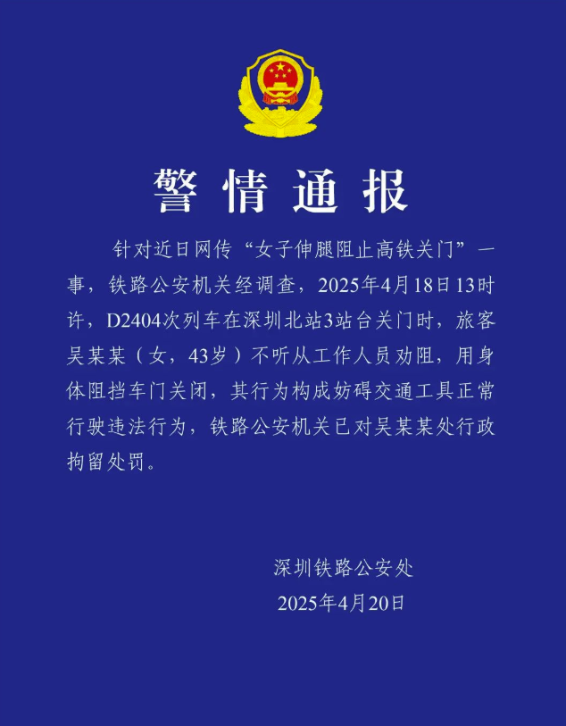 4月18日,一段“女子伸腿阻止高鐵關(guān)門”的視頻在網(wǎng)絡(luò)上引起熱議。視頻中,一名女性旅客強(qiáng)行用身體阻攔車門,兩名工作人員極力制止卻未能成功,直到三名同行人上車才離開車門,隨后列車關(guān)門駛離。4月19日,“@廣鐵集團(tuán)深圳北火車站”發(fā)布情況說明,證實(shí)網(wǎng)傳視頻屬實(shí),并稱未造成列車晚點(diǎn),相關(guān)部門已介入調(diào)查。輿論要求嚴(yán)懲行為人呼聲較高,部分網(wǎng)民不滿工作人員制止不力,對相關(guān)法律規(guī)章制度未嚴(yán)格執(zhí)行。4月20日,深圳鐵路公安處官方微博通報稱,旅客吳某某行為構(gòu)成妨礙交通工具正常行駛違法行為,已被行政拘留。主流輿論點(diǎn)贊警方處置及時,并圍繞“攔門事件何時休”展開討論。如中國網(wǎng)發(fā)文建議,修訂《鐵路安全管理條例》,明確阻礙發(fā)車的量化處罰標(biāo)準(zhǔn),如按延誤時長階梯式罰款。上觀新聞、紅網(wǎng)發(fā)文稱,鐵路部門應(yīng)加大處罰力度,將“危害安全行為”納入個人征信系統(tǒng)、列入限行“黑名單”,形成更強(qiáng)的震懾效應(yīng)。