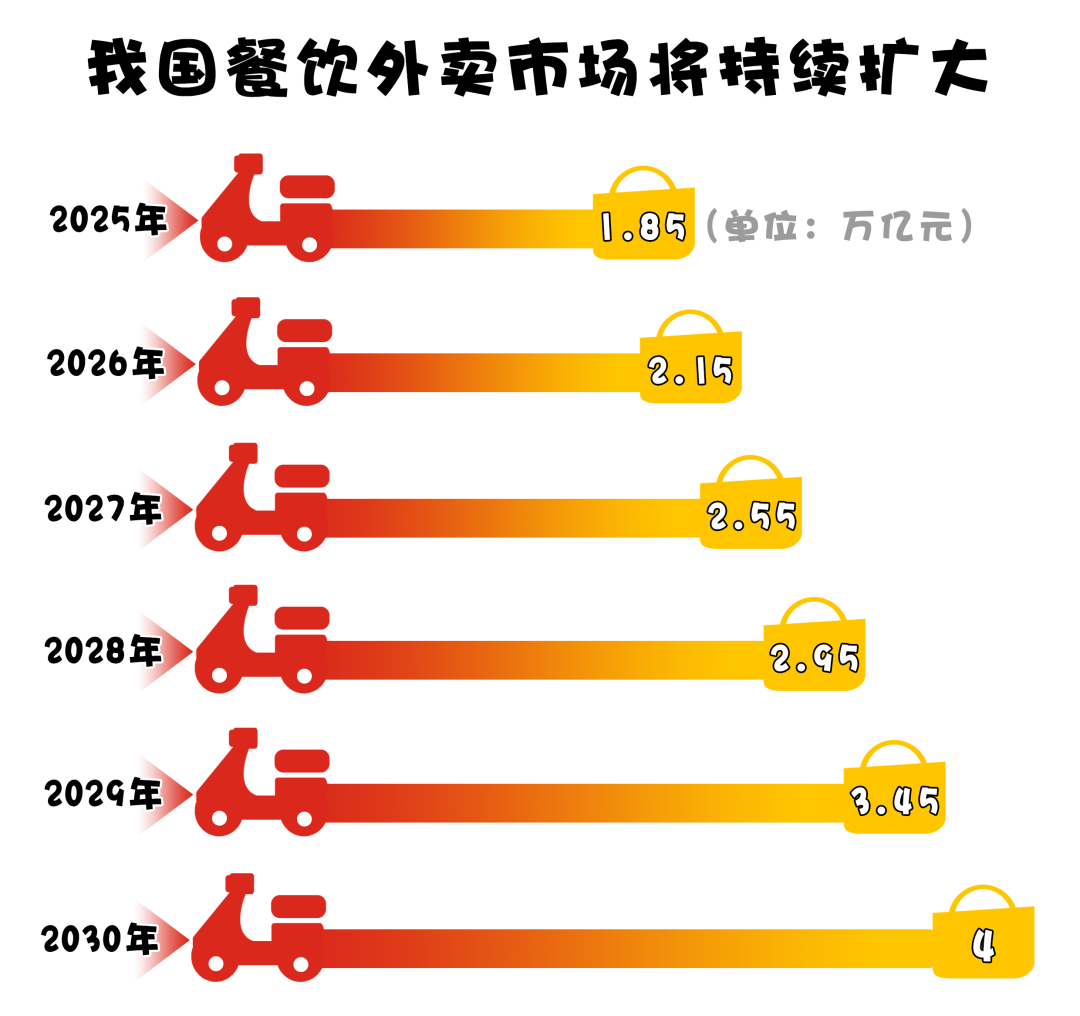 以外賣市場中的餐飲業(yè)為例,數(shù)據(jù)顯示,未來幾年,預計我國餐飲外賣市場規(guī)模將顯著增長,將從2025年的1.85萬億元一路攀升至2030年的4萬億元。這一持續(xù)拓寬的商業(yè)藍海,引得各家外賣平臺摩拳擦掌,“外賣大戰(zhàn)”不時打響。