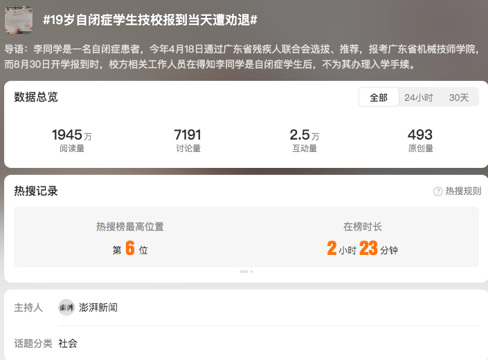 9月9日,澎湃新聞采訪相關(guān)方首發(fā)報道,當(dāng)事同學(xué)父親認(rèn)為,校方的審核、錄取程序存在諸多疏漏,直至入學(xué)報到當(dāng)天才說不予接收,讓學(xué)生錯失了報讀其他學(xué)校的機會。廣東省機械技師學(xué)院宣傳部相關(guān)負(fù)責(zé)人回應(yīng)稱,學(xué)校確實向該同學(xué)發(fā)放錄取通知書,但該殘疾人招生項目主要面向肢體殘疾和言語殘疾學(xué)生,面試時校方教師對該同學(xué)患有自閉癥并不知情。因擔(dān)心對學(xué)校正常學(xué)生造成影響,建議其找其他合適的學(xué)校就讀。該報道發(fā)布后,齊魯晚報、上游新聞、極目新聞等媒體跟進(jìn)轉(zhuǎn)載,輿情開始發(fā)酵,#19歲自閉癥學(xué)生技校報到當(dāng)天遭勸退#微博話題登上熱搜榜第6位。