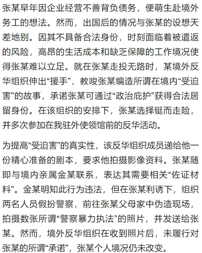 4. “境外反華組織教唆擺拍暴力執(zhí)法” 案。8月14日,國(guó)家安全部公布一起標(biāo)題為《跨境賣(mài)慘終成空》的案例。據(jù)悉,張某國(guó)內(nèi)企業(yè)經(jīng)營(yíng)不善負(fù)債,赴境外務(wù)工后因無(wú)合法身份面臨遣返風(fēng)險(xiǎn)。境外反華組織以“政治庇護(hù)換取居留身份”為誘餌,提供詳細(xì)拍攝劇本,還提出“畫(huà)面暴力血腥”“效果要慘”“抓拍增強(qiáng)真實(shí)感”等要求。在反華組織教唆下,張某聯(lián)系到親屬金某,金某明知此行為違法,但在張某利誘下組織兩名人員假扮警察,前往張某父母家中偽造現(xiàn)場(chǎng),拍攝數(shù)張所謂“警察暴力執(zhí)法”的照片,并將材料發(fā)送境外,但境外反華組織在收到照片后未履行對(duì)張某的所謂“承諾”。該案最終被國(guó)家安全機(jī)關(guān)破獲。央視網(wǎng)、微信公眾號(hào)“俠客島”等轉(zhuǎn)發(fā)相關(guān)內(nèi)容。輿論將此案稱為一場(chǎng)“政治避難”鬧劇,指出“因一己之利參加境外反華活動(dòng),為反華勢(shì)力提供煽宣‘彈藥’,但最終竹籃打水一場(chǎng)空”。
