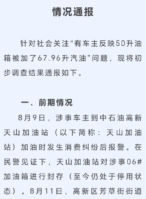 據(jù)澎湃新聞8月20日報道,8月9日,車主楊某駕駛油箱總?cè)萘?0升的小車,在成都市中石油錦華天山站加油,油箱顯示為其加注了67.96升汽油。楊某提出異議后,加油站表示只認(rèn)油槍數(shù)據(jù),堅持按67.96升收費,楊某最終結(jié)賬離開。結(jié)賬離開前,楊某先后向公安機(jī)關(guān)、市監(jiān)局、12345熱線等多部門投訴,并要求加油站封槍。三天后,加油站一負(fù)責(zé)人以私人名義將多收的錢退給楊某,希望其同意油槍解封,但解封后加油站沒有給出過任何解釋。在“問政四川”平臺上,成都市高新區(qū)管委會回復(fù)“將在15個工作日詳細(xì)回復(fù)”;高新區(qū)市場監(jiān)督管理局綜合執(zhí)法部門工作人員表示,有了進(jìn)展辦案人員會聯(lián)系投訴人。部分自媒體和網(wǎng)民圍繞事件原因進(jìn)行討論,要求官方給出一個透明、準(zhǔn)確的調(diào)查結(jié)果。深圳廣電集團(tuán)都市頻道“@第一現(xiàn)場”還評論稱,“監(jiān)管部門不應(yīng)沉默”。