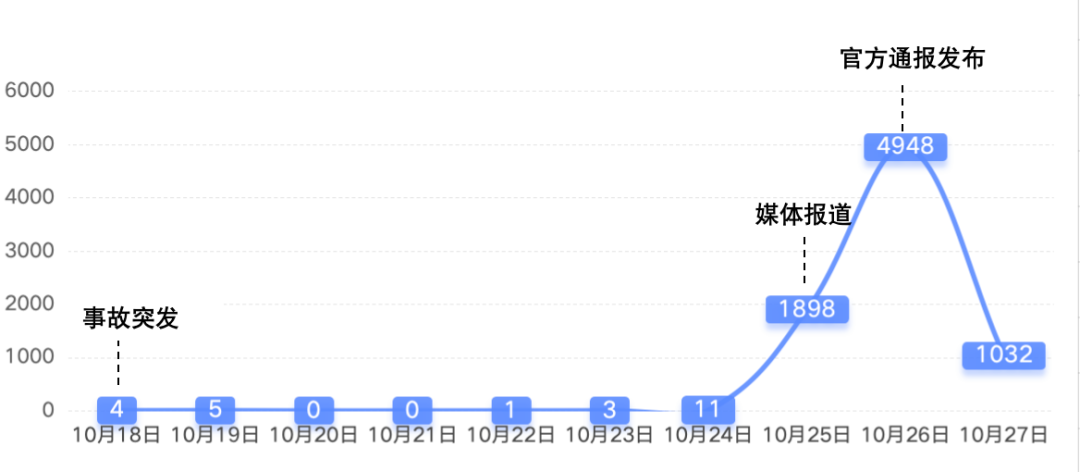 自10月18日起,少量網(wǎng)民發(fā)布事故信息引發(fā)關(guān)注,25日媒體介入報道推動輿情熱度快速攀升,官方發(fā)布通報后輿情信息量達(dá)觸頂峰。截至10月28日10時,相關(guān)信息8061條,相關(guān)微博話題閱讀量累計達(dá)1.15億。