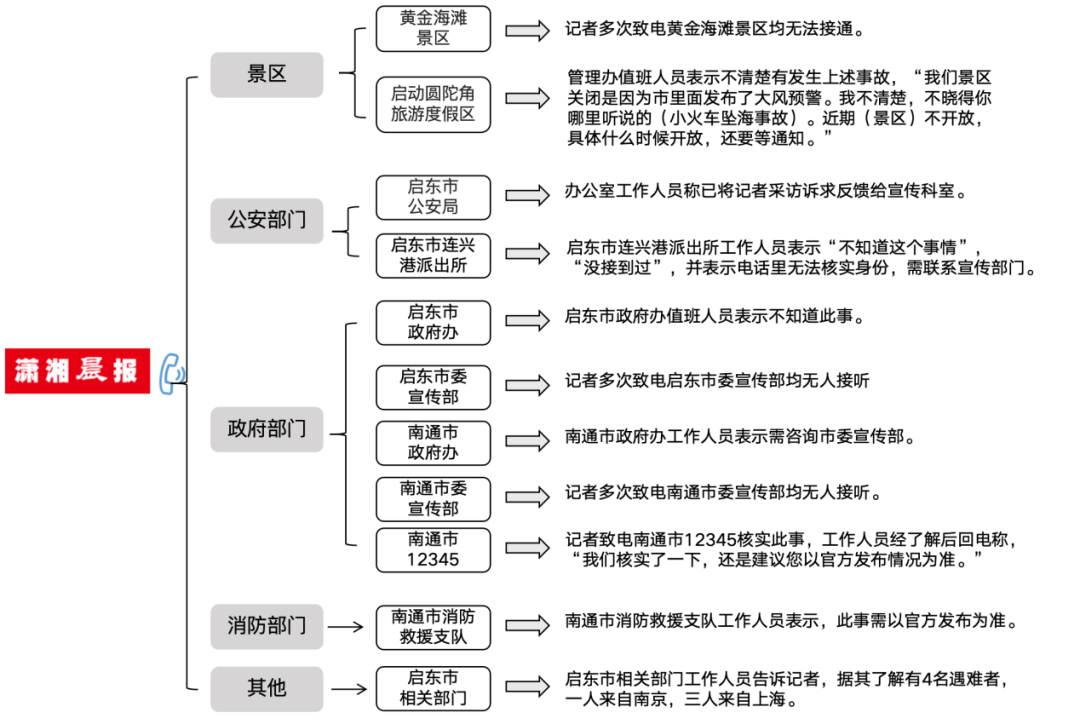 10月25日13時許,瀟湘晨報報道稱,江蘇一海灘景區(qū)觀光小火車疑發(fā)生事故致多人傷亡。記者向景區(qū)及市縣十余個部門致電,但回應(yīng)均為“不清楚”“不知道此事”“等官方發(fā)布通知”“聯(lián)系宣傳部門”(回復(fù)情況見下圖)。啟東市相關(guān)部門工作人員表示,據(jù)其了解有4名遇難者,一人來自南京,三人來自上海。
