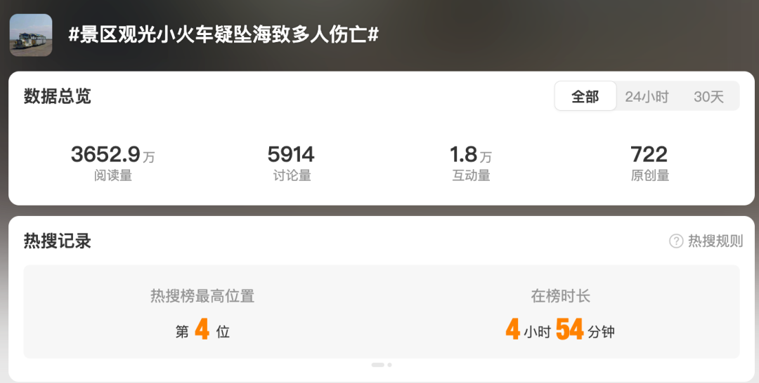 隨后,紅星新聞、極目新聞、上游新聞等媒體跟蹤報道,進(jìn)一步還原事故發(fā)生情況、傷亡情況及善后工作。如紅星新聞采訪知情人報道稱,乘坐小火車的都是景區(qū)的散客,小火車開到海邊的一個大門處時被攔住了,有工作人員提到有預(yù)警,這個游覽項目不開放,“可能是做了工作,又讓他們?nèi)チ恕?。在整個行程快結(jié)束的時候,有一段路是沒有防浪的坡道,浪把游客打到海里。有的游客抓住相對穩(wěn)固的東西防止自己被風(fēng)浪卷走,但仍等了約2個半小時才獲救。當(dāng)日,微博話題“#景區(qū)觀光小火車疑墜海致多人傷亡#”“#多方回應(yīng)觀光火車疑墜海多人傷亡#”“#游客稱小火車出發(fā)前曾被攔后放行#” 登上熱搜榜。多數(shù)網(wǎng)民對事故造成人員傷亡感到痛心;部分網(wǎng)民不滿信息公布不及時、不透明,質(zhì)疑相關(guān)部門回應(yīng)“一問三不知”“踢皮球”;部分網(wǎng)民希望相關(guān)部門盡快發(fā)布詳細(xì)通報。