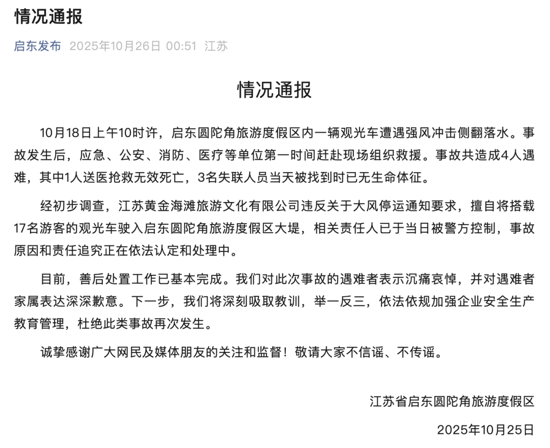 10月26日凌晨,啟東市委宣傳部官方公眾號“啟東發(fā)布”通報稱:10月18日上午10時許,啟東圓陀角旅游度假區(qū)內(nèi)一輛觀光車遭遇強(qiáng)風(fēng)沖擊側(cè)翻落水。事故發(fā)生后,應(yīng)急、公安、消防、醫(yī)療等單位第一時間趕赴現(xiàn)場組織救援。事故共造成4人遇難,其中1人送醫(yī)搶救無效死亡,3名失聯(lián)人員當(dāng)天被找到時已無生命體征。經(jīng)初步調(diào)查,江蘇黃金海灘旅游文化有限公司違反關(guān)于大風(fēng)停運(yùn)通知要求,擅自將搭載17名游客的觀光車駛?cè)雴|圓陀角旅游度假區(qū)大堤,相關(guān)責(zé)任人已于當(dāng)日被警方控制,事故原因和責(zé)任追究正在依法認(rèn)定和處理中。目前,善后處置工作已基本完成。