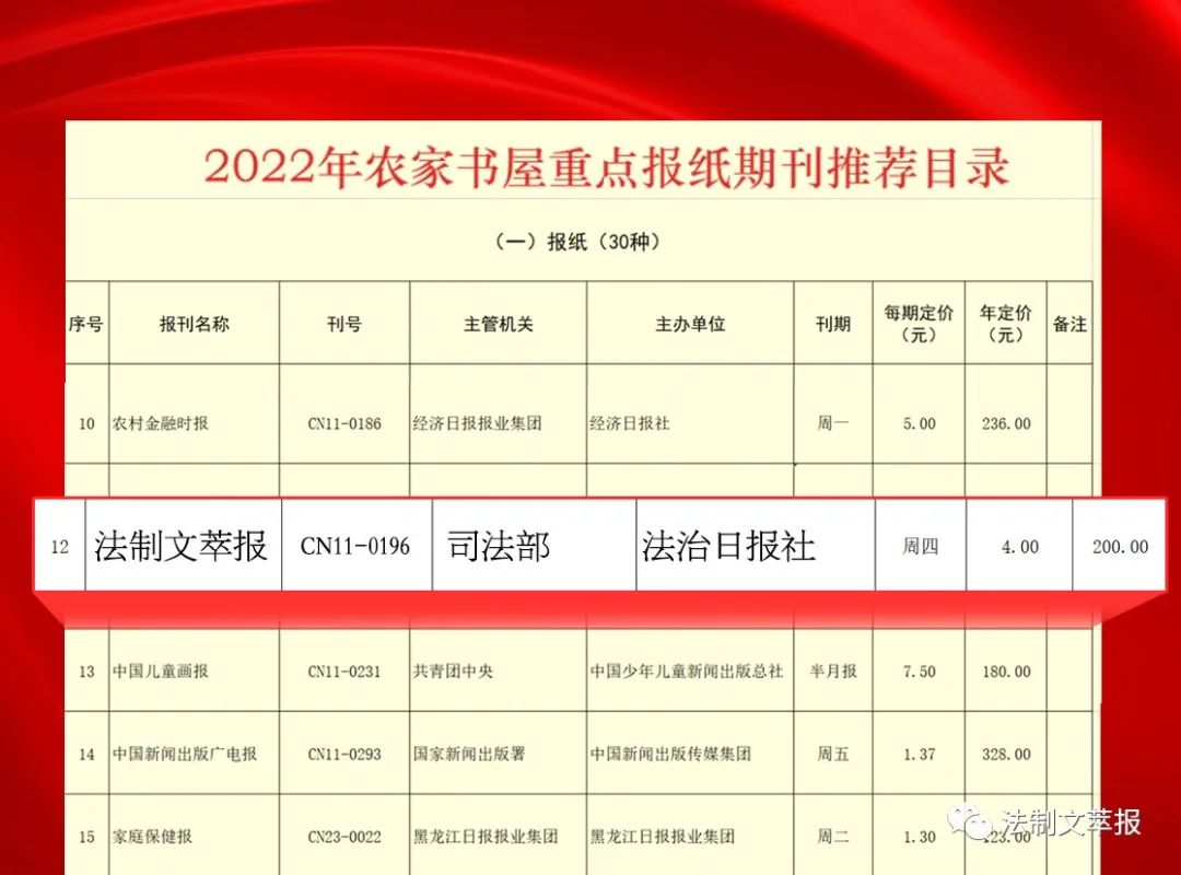 為深入學(xué)習(xí)宣傳貫徹習(xí)近平新時代中國特色社會主義思想,迎接黨的二十大勝利召開,指導(dǎo)各地做好2022年農(nóng)家書屋出版物補充更新工作,國家新聞出版署組織制定了《2022年農(nóng)家書屋重點出版物推薦目錄》。《推薦目錄》分重點圖書、重點報紙期刊、重點音像制品和電子出版物、重點少數(shù)民族文字圖書四類?!斗ㄖ莆妮蛨蟆烦蔀橹攸c報紙期刊推薦目錄中唯一一家法治類報紙。