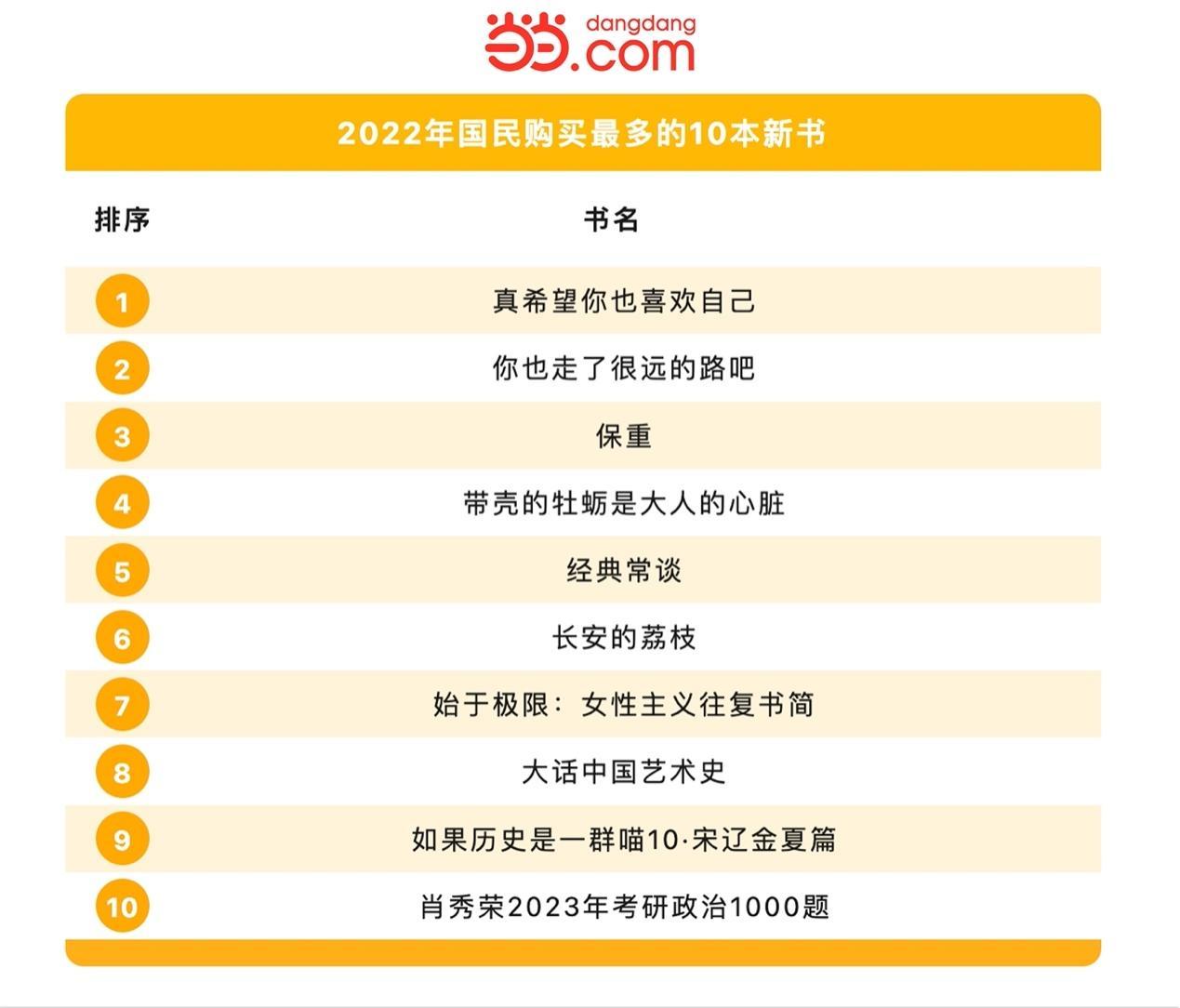 2022年國民購買最多的10本書中,心理學(xué)、療愈類、成功勵志、嚴(yán)肅文學(xué)、科幻書籍霸榜。邊躺邊卷是年度閱讀主題,一方面讀者通過自助心理類,心靈療愈類、嚴(yán)肅文學(xué)類書籍對抗精神內(nèi)耗,尋求自洽;一方面又通過成功勵志類、科幻類等書籍尋求積極、振奮的心態(tài)。