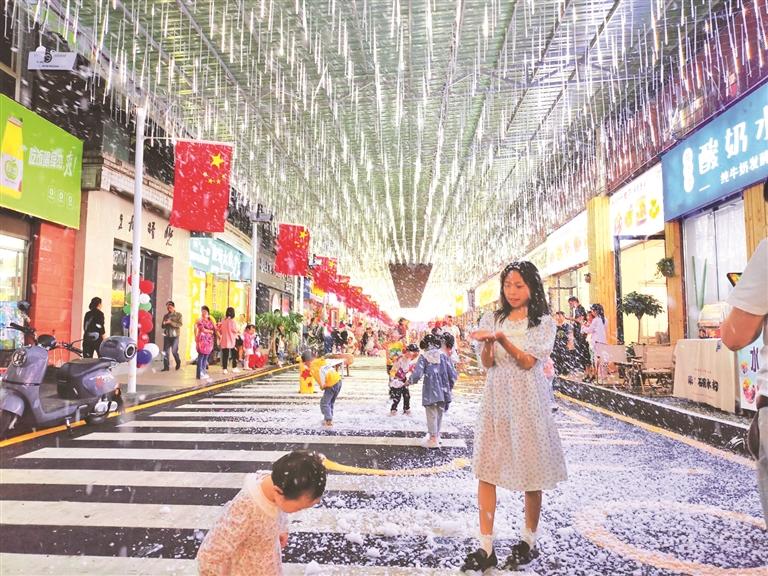 這是一個曾經門可羅雀的小區(qū)商區(qū),建在一個低矮的斜坡上。以前,車輛亂停亂放,環(huán)境臟亂差,一排排門面成為閑置資產。去年夏天,為緩解城北奢香古鎮(zhèn)夜間經濟人客爆滿的壓力,同時發(fā)展地攤經濟增加居民就業(yè),紅旗街道利用這批閑置門面,投入150萬元打造夜間燈光秀和進行墻體文化建設,成功改造為豆干美食一條街,收到了立竿見影的效果。