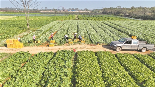 在廣西農(nóng)啟生態(tài)農(nóng)業(yè)科技有限公司的果蔬分揀中心,50多名工人正對收購上來的蔬菜進(jìn)行分揀、打包。公司總經(jīng)理戴開旺介紹,公司和當(dāng)?shù)氐?0多家合作社、種植大戶簽訂收購協(xié)議,去年冬種以來,共收購各類蔬菜約535噸。
