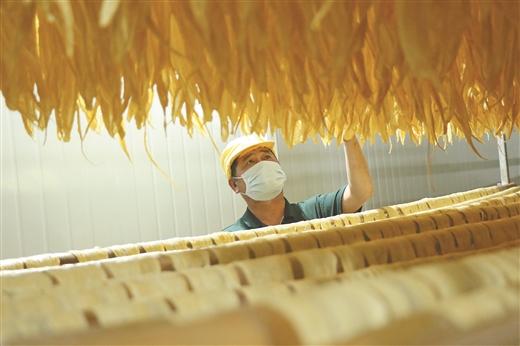 工人在車(chē)間內(nèi)烘干腐竹 廖偉 攝