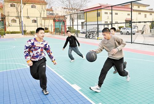 3月16日,寧晉縣黃兒營(yíng)西村青少年在村里的民樂廣場(chǎng)籃球場(chǎng)打籃球。記者 王偉宏 攝