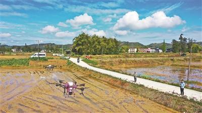 星橋鎮(zhèn)新農(nóng)人操作無人機開展水稻播種社會化服務。劉輝 攝