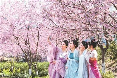 漢服愛好者們?cè)诖禾斓谋尘鞍迳稀氨M情創(chuàng)作”,不僅在造型上改造得更輕便,還根據(jù)不同花的配色搭配服飾,油菜花配嫩黃,櫻花配霞粉。