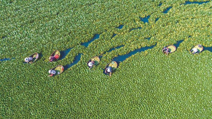 天井湖村千畝菱角豐收,村民正在采摘。