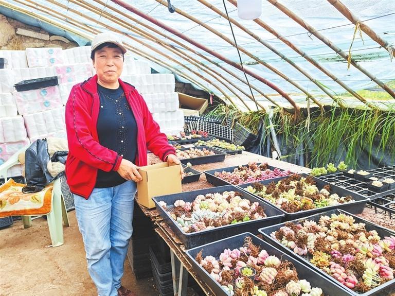 浪街村村民張淑英打包外銷的多肉植物。記者 王朝霞 攝