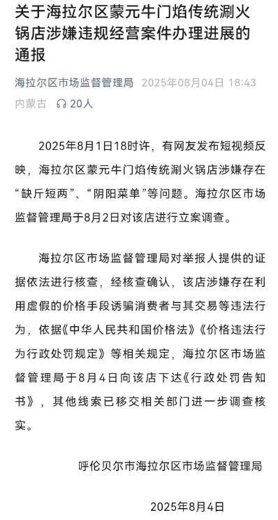 近日,內(nèi)蒙古呼倫貝爾市海拉爾區(qū)一家火鍋店因“陰陽菜單”和缺斤少兩問題被推上輿論風(fēng)口。一名博主和朋友通過視頻揭露,該店存在明顯的消費(fèi)欺詐行為。
