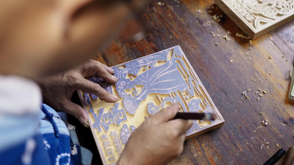 7月5日,喜洲匠志集民藝中心甲馬版畫藝術(shù)館內(nèi),工匠正在雕刻甲馬。新華社發(fā)(羅曉川攝)