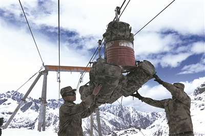 連隊通過索道將補(bǔ)給物資運(yùn)送到哨所。