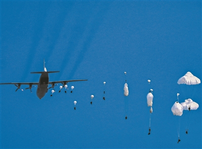 凌晨4時,數(shù)架滿載全副武裝傘兵的大型運輸機,依次騰空而起向預(yù)定空域機動。