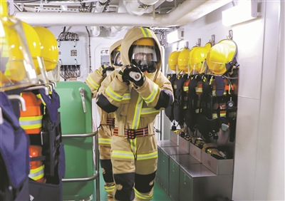 “后機艙起火!”剛剛處置完“敵”情,成都艦又遇險情。戰(zhàn)救小組人員迅速切斷電源、提取滅火器、鋪放水龍帶……
