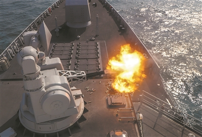 航行途中,編隊各艦雷達相繼發(fā)現(xiàn)空中可疑目標,官兵立即進入戰(zhàn)斗狀態(tài)。成都艦作戰(zhàn)室內(nèi),鍵盤聲、口令聲此起彼伏?!伴_火!”判明并鎖定目標后,艦長果斷下達攻擊命令。