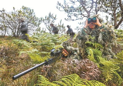 圖③:戰(zhàn)術演練中,擔當狙擊手的新戰(zhàn)士占領有利地形,掩護突擊組行動。