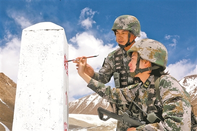 1號界碑位于雪山達(dá)坂上,道路崎嶇,常年積雪。巡邏隊(duì)伍經(jīng)過4個(gè)多小時(shí)的艱難跋涉,終于到達(dá)。站在界碑旁,官兵們面向國旗莊嚴(yán)宣誓:“我們一定會守好祖國的每一寸土地!”