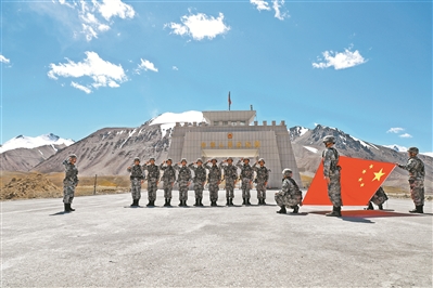 近日,新疆喀什軍分區(qū)紅其拉甫邊防連組織即將退役的士兵進(jìn)行告別國門儀式。圖為守邊戰(zhàn)士面向國旗莊嚴(yán)宣誓,他們紛紛表示,到地方后會續(xù)寫軍人新風(fēng)采。李小龍攝