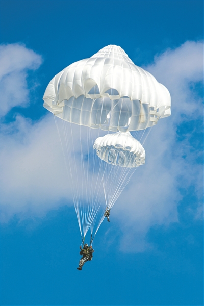 飛抵預(yù)定空域,在抗“藍(lán)軍”反空降火力掩護(hù)下,裝備物資首先投放,全副武裝的學(xué)員緊隨其后實(shí)施集群傘降,朵朵傘花在天空競(jìng)相綻放。