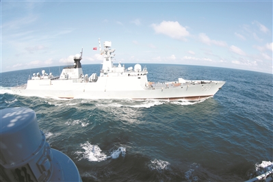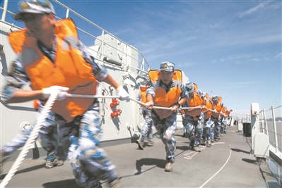 演訓(xùn)不避險,緊貼實戰(zhàn)練。幾天時間里,編隊訓(xùn)練全程融入戰(zhàn)術(shù)背景,立足實戰(zhàn)需要,先后完成主炮對海射擊、副炮對空射擊、實射火箭深彈、編隊航行補給占位、營救落水人員等20多個課目訓(xùn)練。
